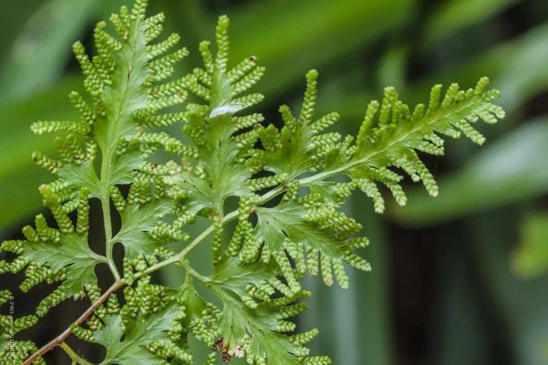 不認識海金沙的人來看一看它的植株形特征,一株海金沙它能夠攀爬1到4米左右。它的葉具有窄邊,羽片多數,尖三角形,葉子干后是褐色的,紙質形。秋冬季海金沙的孢子粉成熟,采摘細如黃沙,如海沙發亮發光而得名海金沙。