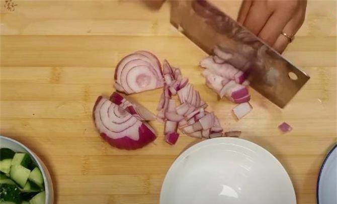 2.現在該處理洋蔥了,切洋蔥的時候記得準備一碗清水放在旁邊,這樣就不會辣眼睛了,洋蔥咱們把它切成小丁。