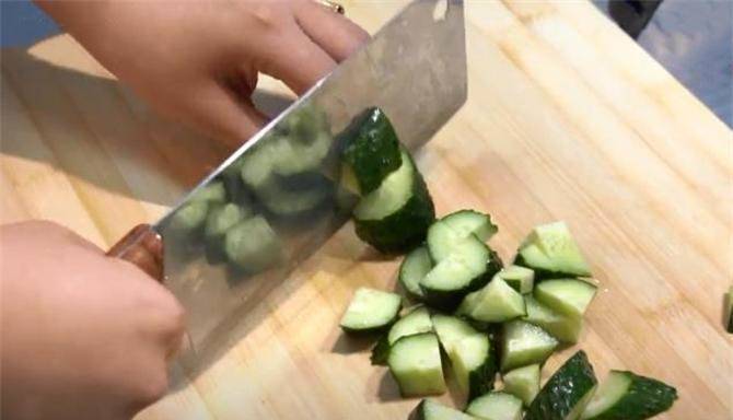 1.準備的食材有花生、洋蔥、黃瓜,咱們先處理一下黃瓜,黃瓜先切成片,然后再改刀切成小塊。