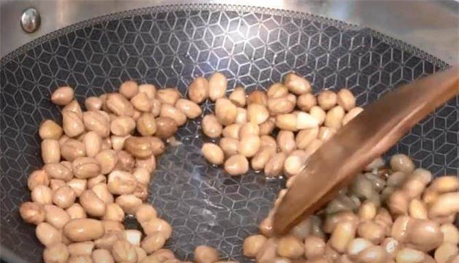 4.鍋內倒入適量食用油,現在油熱了,我們把提前泡好的花生放進去炒一下,等炒到有明顯的【啪☆啪】聲的時候,我們把花生豆盛出來。
