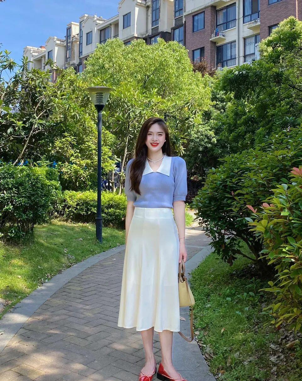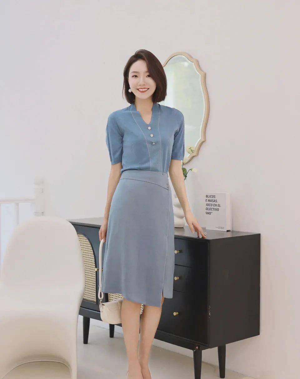 藍色的毛衣和裙子同色系組合,簡約優雅又不失時尚感。搭配白色高跟鞋,看起來更加輕盈靈動,讓人遐想不已。包包的選擇也恰到好處,為整個造型增添了知性優雅的氣質。▼