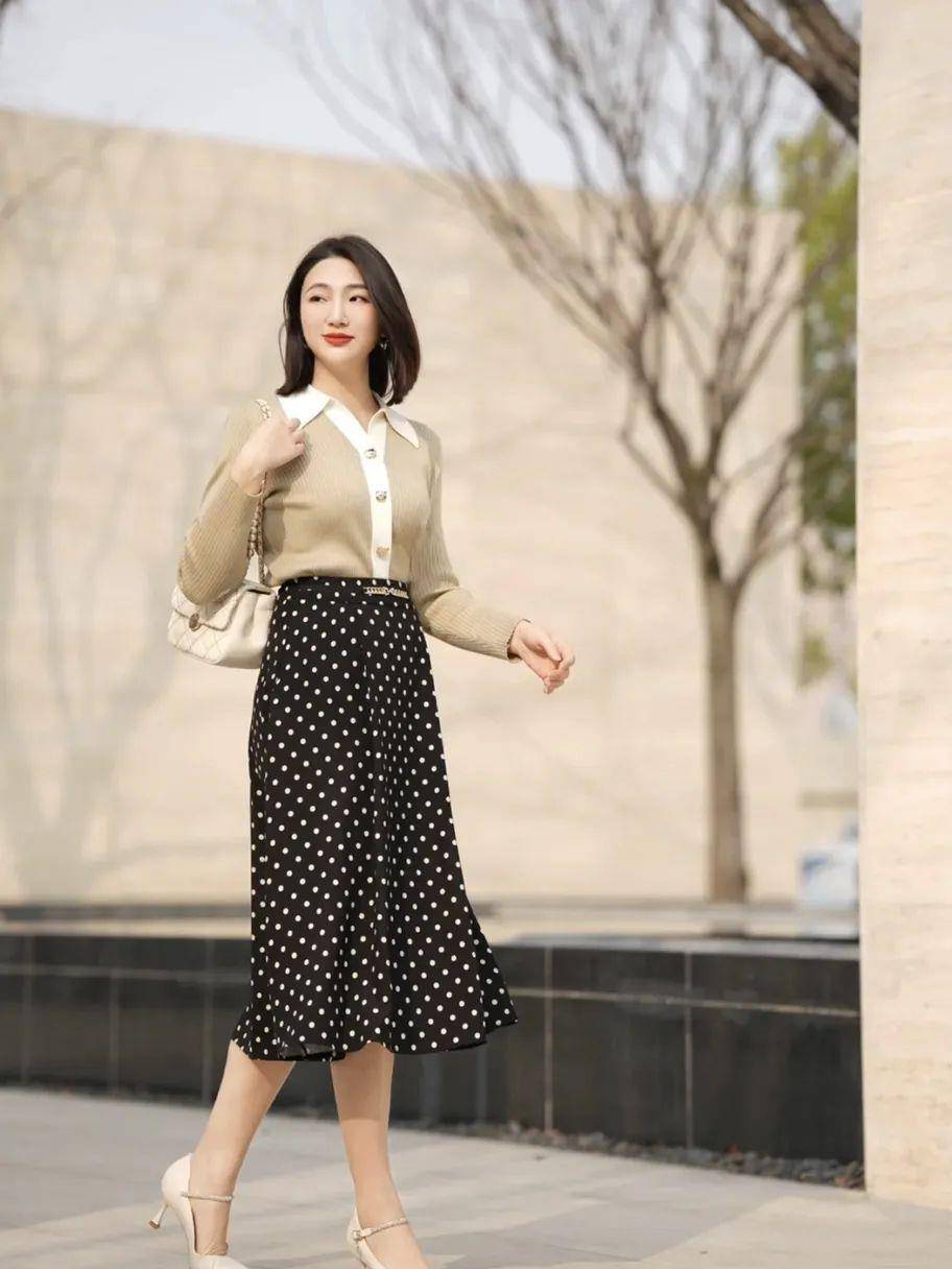 走在通勤路上,一身清新精致的穿搭引人注目。淺卡其色毛衣搭配黑白圓點半身裙。雪紡裙在風中優雅舞動,讓人感覺夢幻又美麗。一雙高跟鞋不僅讓整體看起來更加優雅,也讓腳步變得更加輕盈、自由。▼