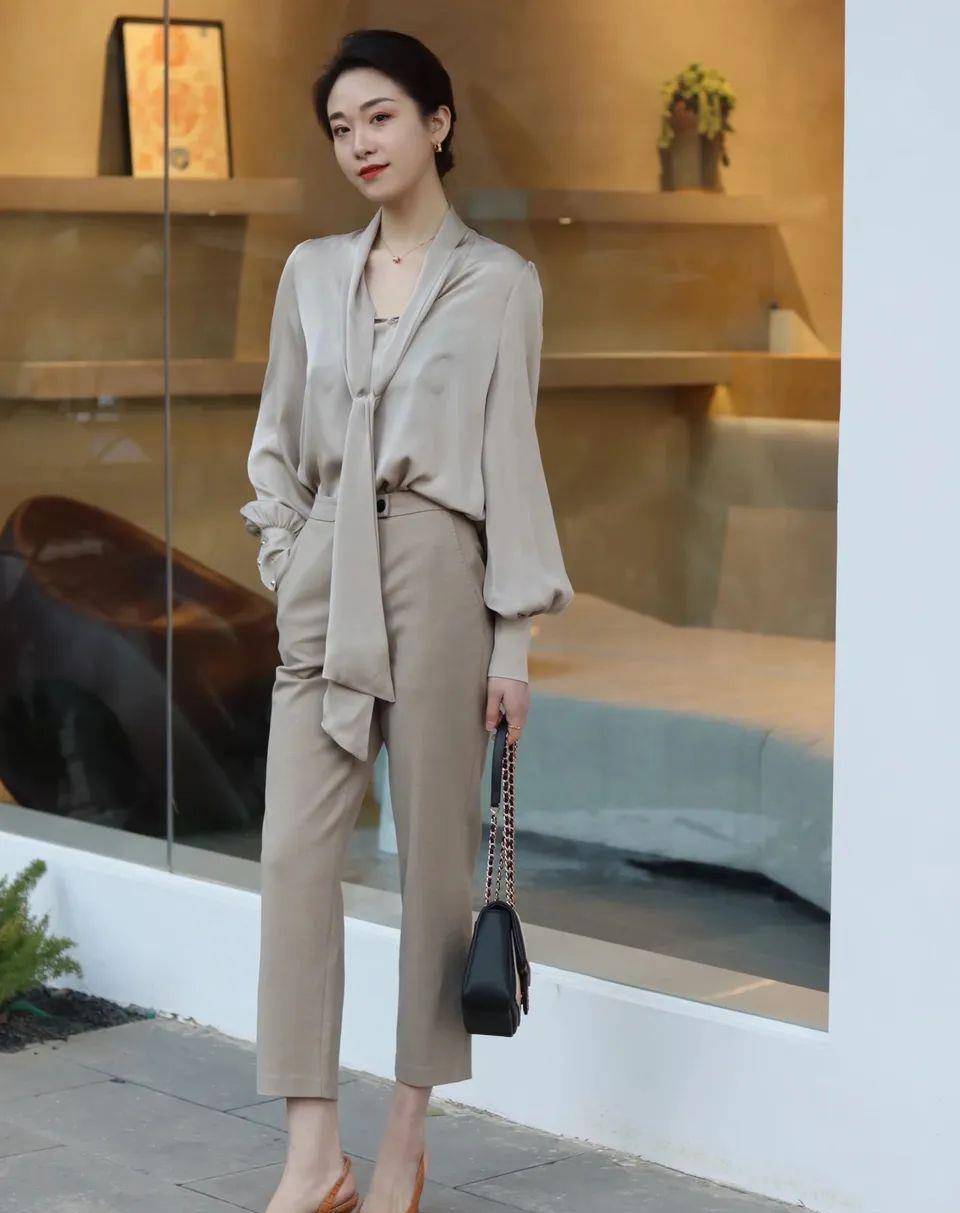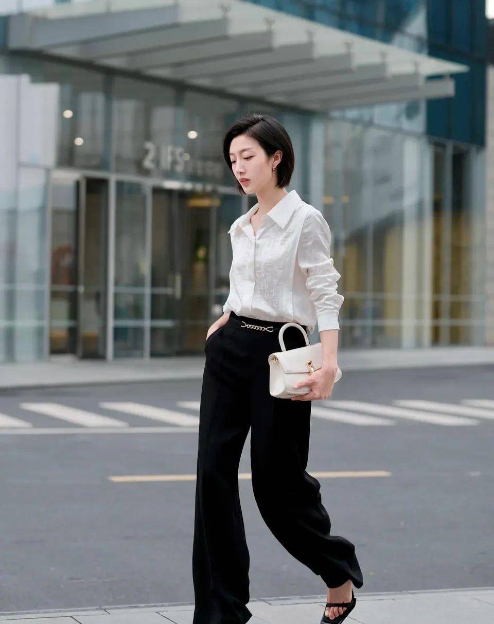 三、干練褲職場女性要時刻保持干練、威嚴的形象。一套簡單的白襯衫搭配黑色西裝褲,既不失穩重,又不缺乏時尚元素。一款白色的包包可以給整個造型增添輕盈和柔和的感覺,讓人在忙碌的工作中也能保持優雅和自信。▼