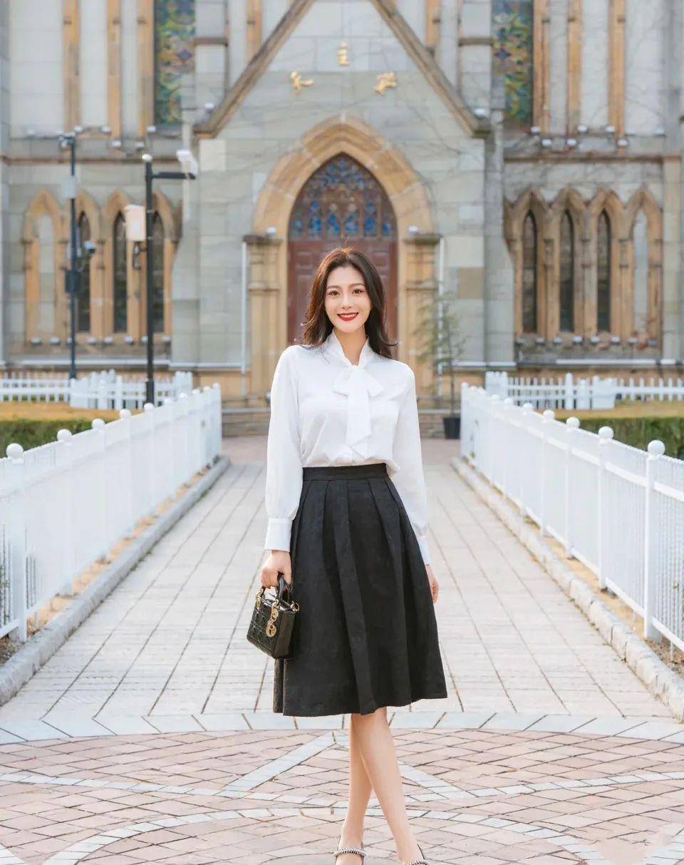 1.優雅的裙子白色絲帶襯衫與黑色傘裙的搭配,充滿女人味和優雅氣質。襯衫的飄帶在風中輕輕飄揚,凸顯了裙子的輕盈感。一雙高跟鞋會讓整個造型更加完整,讓你更加自信和魅力。▼