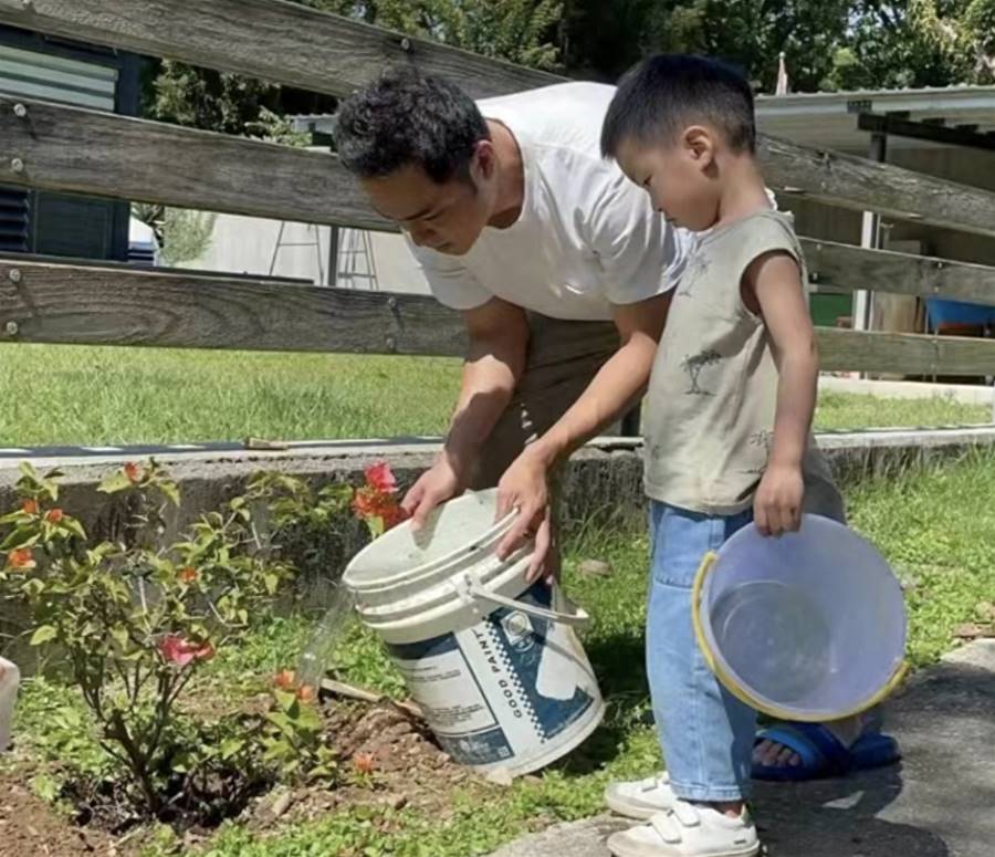 這幾年,明道經常陪伴妻兒,不光和兒子一起玩耍,還帶著兒子一起種花,陪伴小家伙成長。