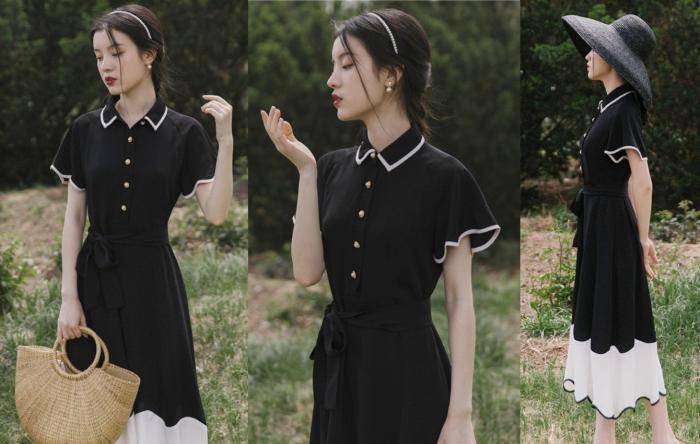 經典黑白面料,透氣垂感。袖口特別做了波浪邊讓你看起來更顯苗條,珍珠紐扣裝飾更有赫本風格,收腰更顯纖細腰身。這是一件必備的衣服。