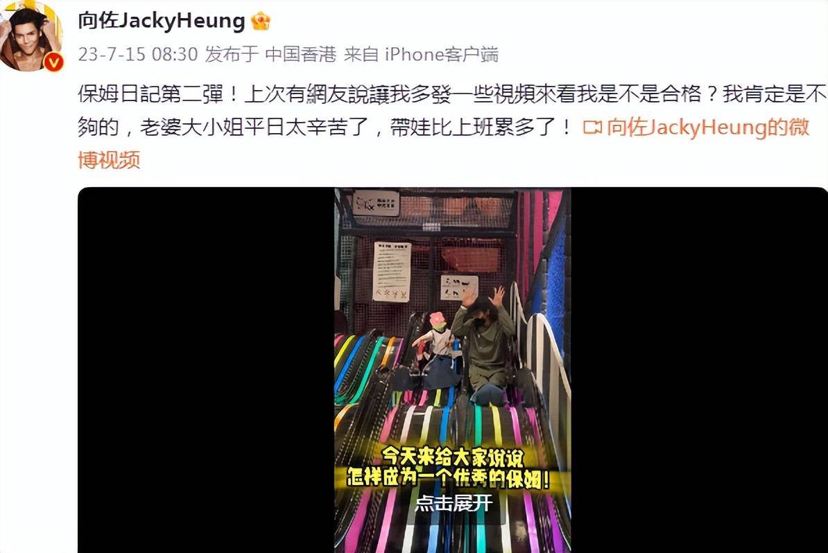 7月15日一早,向佐在个人社交平台分享出与老婆郭碧婷一起带着一双儿女游乐场玩耍画面,自称是保姆的他还附文写道:“保姆日记第二弹!上次有网友说让我多发一些视频来看我是不是合格?我肯定是不够的,老婆大小姐平日太辛苦了,带娃比上班累多了!”一字一言中写满对老婆的体贴与宠溺。