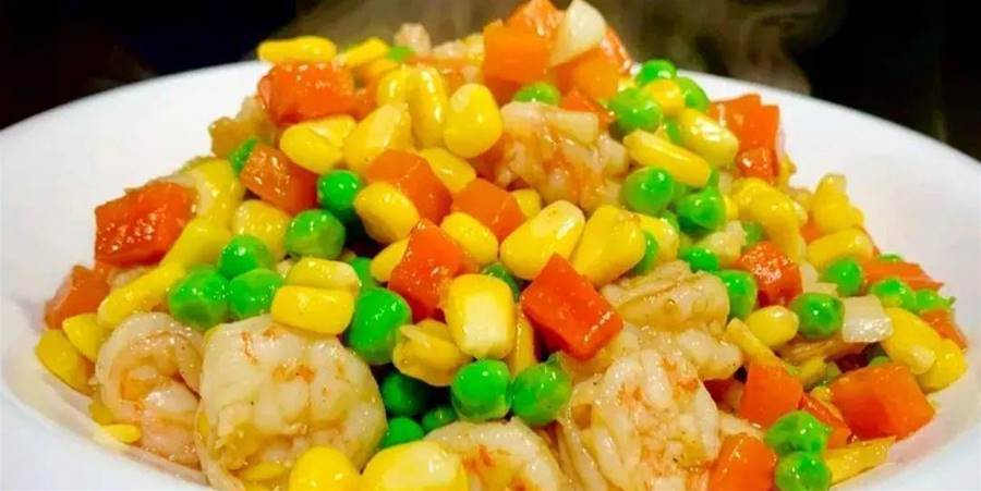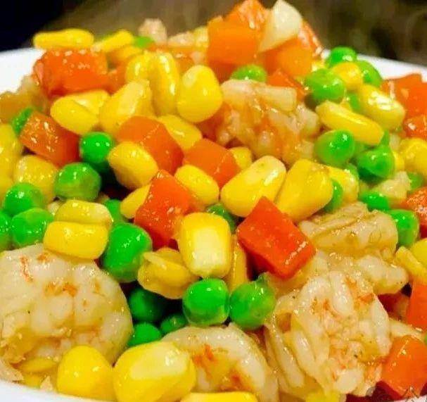 4、鍋中水燒開,加入一勺食用鹽,然后把胡蘿卜,甜豆,玉米粒焯水一分鐘左右。接下來起鍋,油熱之后把姜蒜末炒出蒜香味,然后把蝦肉放進來。繼續開大火炒熟以后,再把所有的配菜加進來,翻炒均勻,再把調好的料汁也加進來,炒均勻就可以出鍋啦。