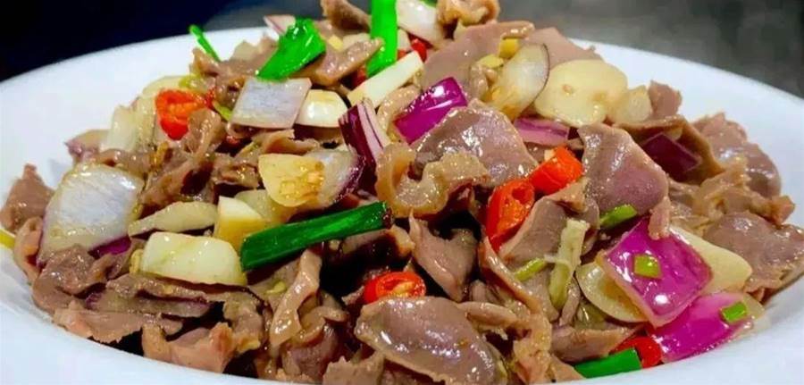 3、把鴨胗放到鍋中炒出多余水分,盛出來備用。接下來熱以后,把姜蒜末、小米辣炒香以后,把鴨胗放入鍋中,炒至入味。再加入一勺生抽,雞精,洋蔥,蒜條苗加進來,要開大火翻炒均勻,就做好了。