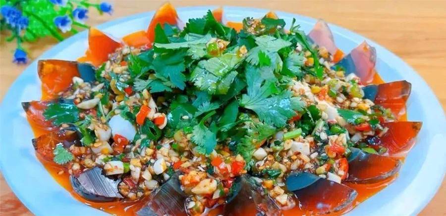 1、準備幾個皮蛋放入鍋中,水燒開后煮六分鐘。再把皮蛋殼剝掉,然后分成四份。再把皮蛋擺入盤中。