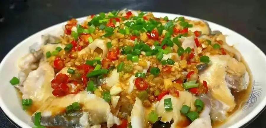 5、然后再把魚片也加進來,開小火燙一分鐘左右撈出,鋪在魚塊上面,然后再把調好的料汁澆在魚片上面,再撒上蔥花。淋入滾燙的熱油,激發出香味。
