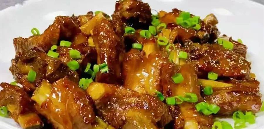 3、全部都煮爛后,把里面的香料都夾出來,再轉大火把湯汁收濃,湯汁也把它淋到排骨上,最后再撒上一點蔥花,紅燒排骨就做好了。