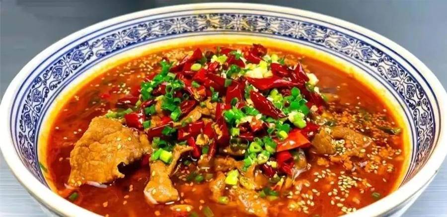 4、再將腌好的牛肉慢慢的下入鍋中,下牛肉的時候記得把火給關掉,這樣才能夠保證牛肉的成熟度一致,煮開后用勺子給它推動,避免粘連在一起。鍋中攤開煮五秒左右,將牛肉給盛出,再依次撒上辣椒,花椒,蒜末,小蔥花,白芝麻。給它潑上熱油,激發香味,水煮牛肉就可以了。