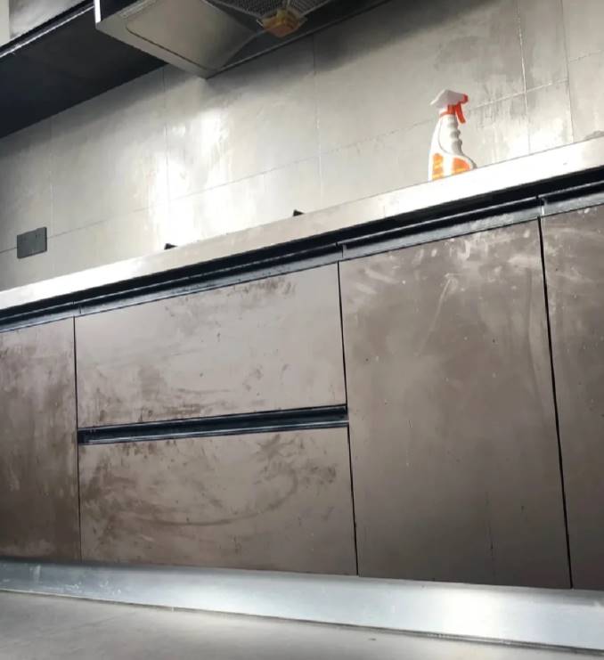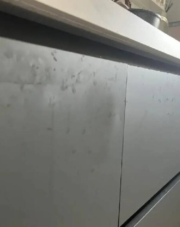 當時我知道膚感門難打理,卻不知道這麼難打理,真的超出了我的想象,因為膚感門的質感,對廚房的油煙和潮氣環境非常不友好,輕微的水蒸氣和油污沾到門板上就非常明顯,越擦越花,做一次飯就要打掃一次,太麻煩了。