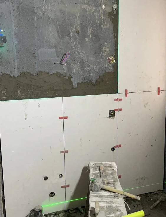 當初在網上看各種博主安利什麼大磚上墻,600×1200豎帖,剛好夠衛生間的高度,殊不知錢包根本遭不住,一個廚房兩個衛生間用了70袋瓷磚膠,還不敢用差的,得符合C2標準的玻化磚瓷磚膠。