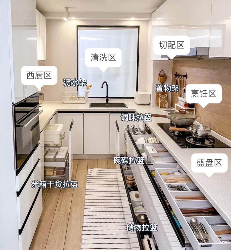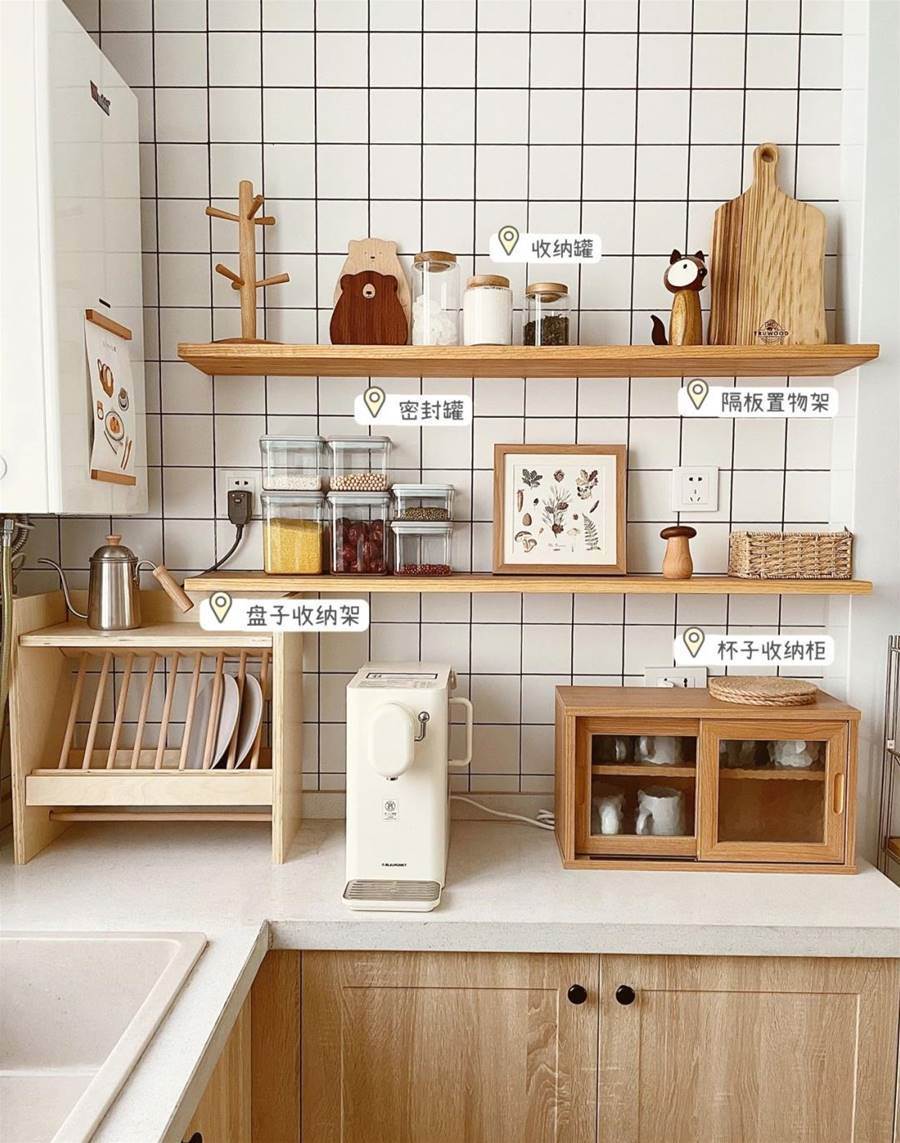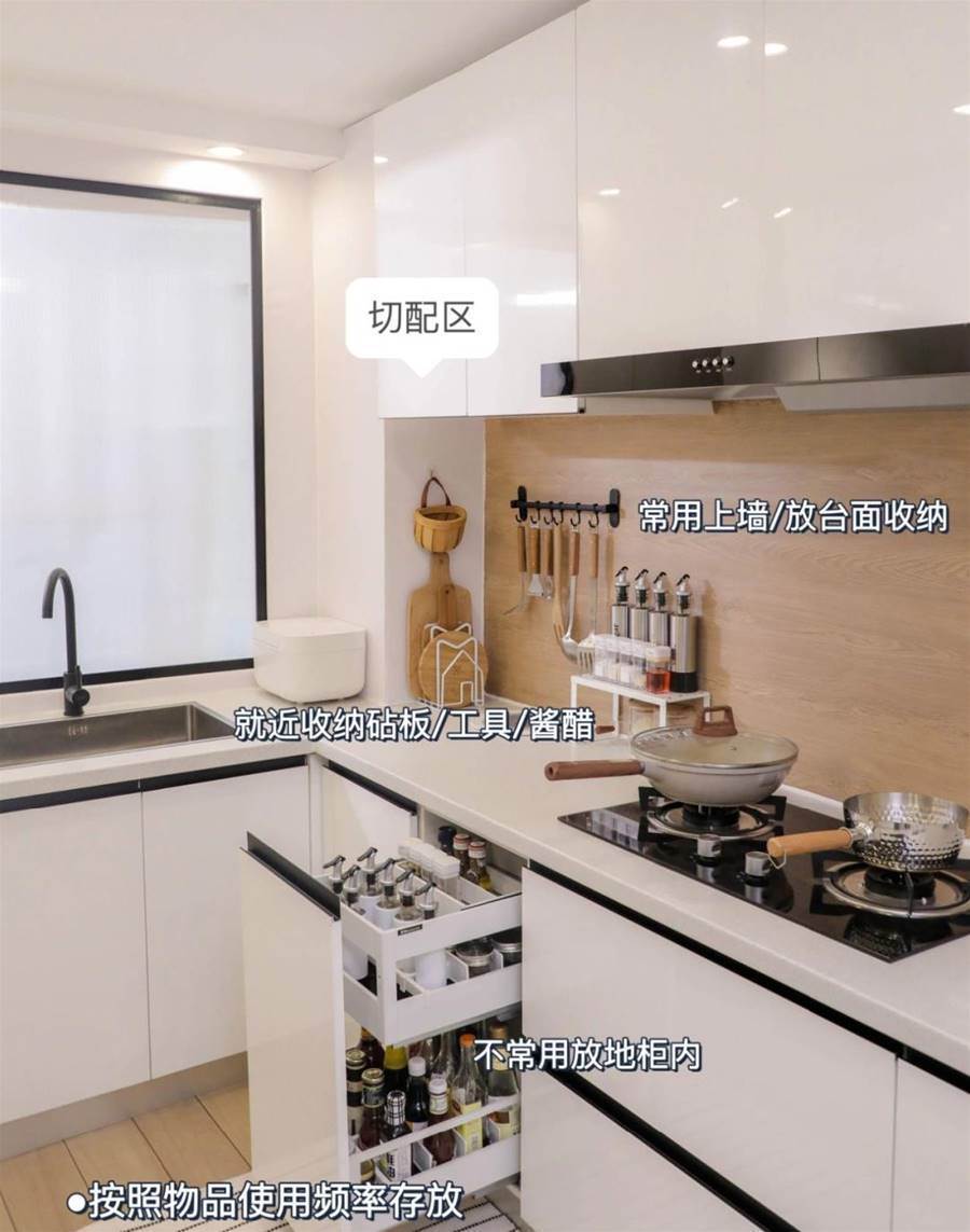為了避免廚房的雜亂,可以使用就近原則。將針對不同區域使用的物品,收納在與之屬性相匹配的區域,這樣能夠讓廚房更加井井有條。