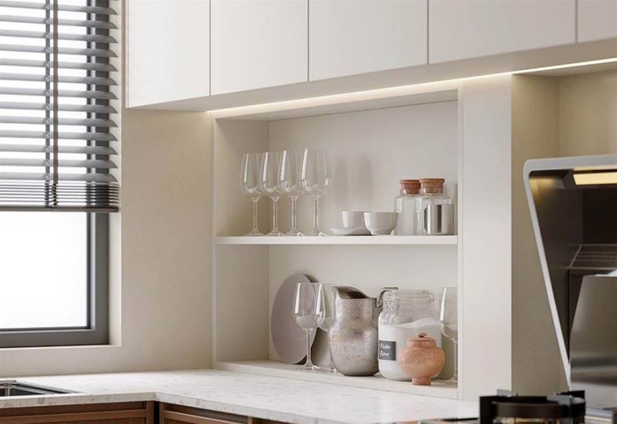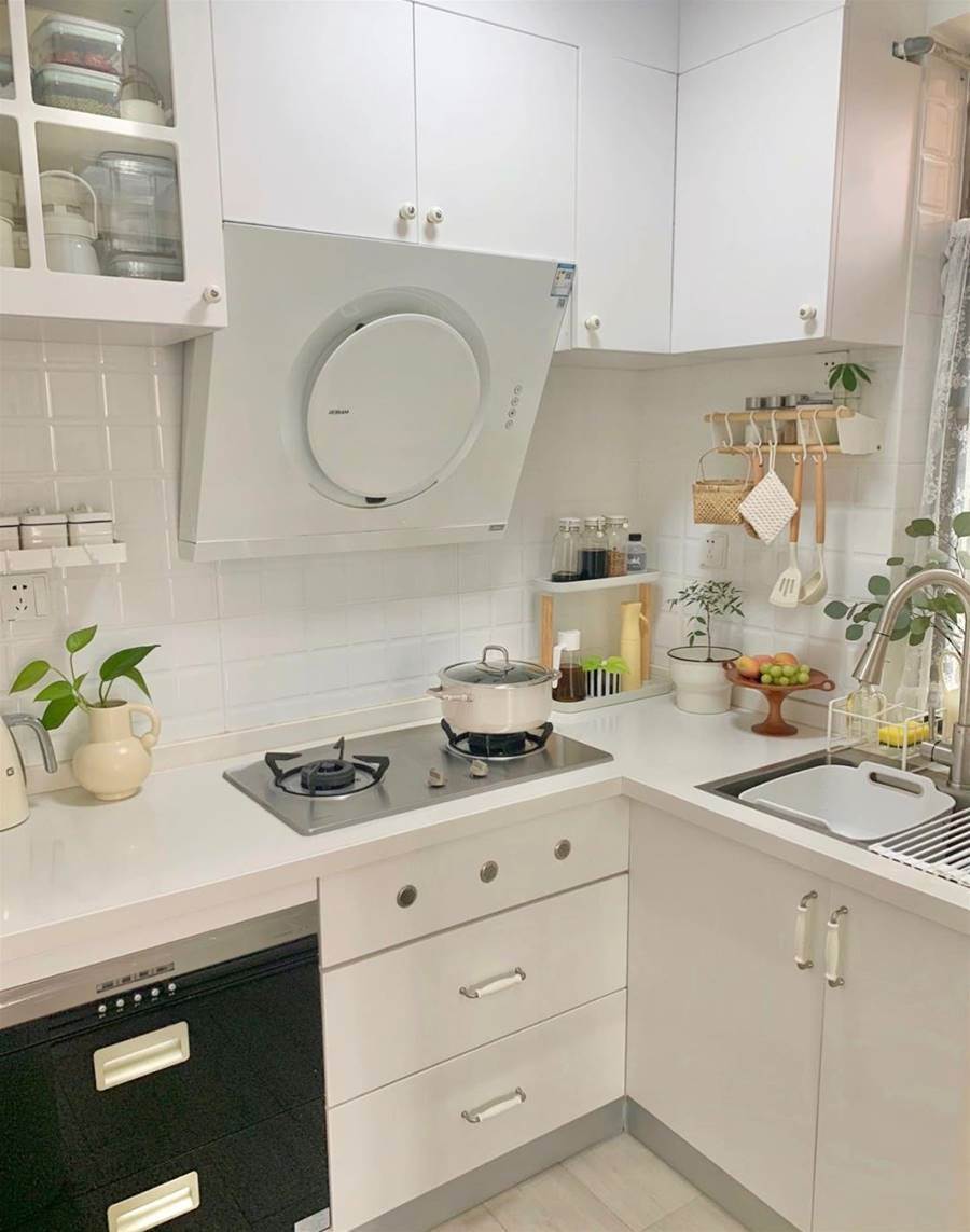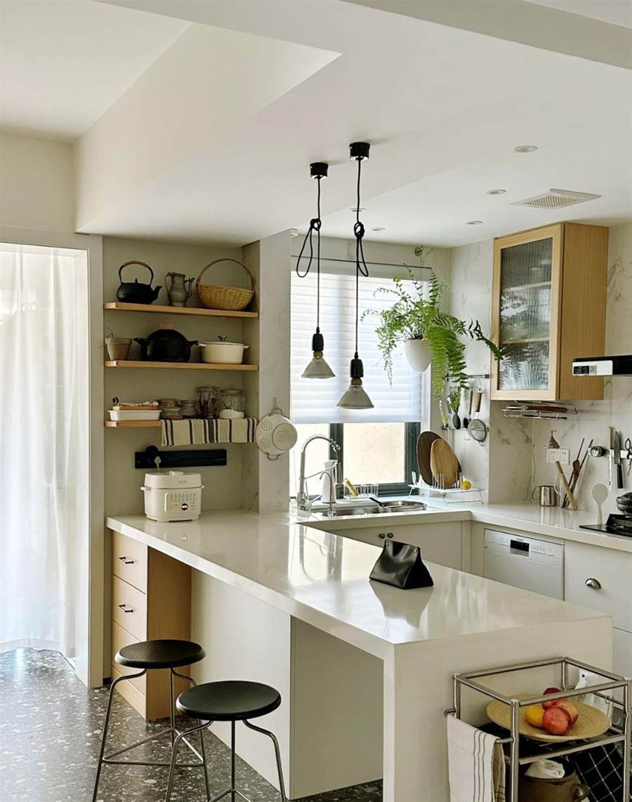對于面積小的廚房來說,收納柜就顯得尤為重要。常用和不常用的物品都應該被妥善收納,只留下隨手可用的物品在台面上,讓廚房整潔清爽。