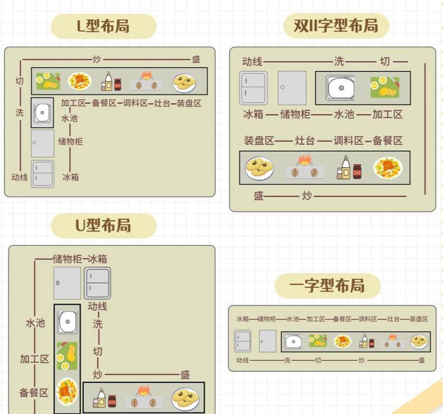 廚房布局有多種形式,主要有一字型、L型、U型和中島式。