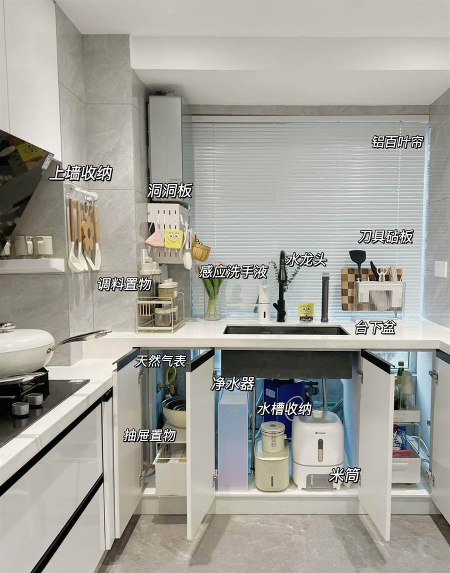 使用二八法則進行收納,就是將20%的物品放在明面上,剩下的80%藏在柜子里。這樣能夠使廚房整潔清爽,只有常用的東西放在手邊。