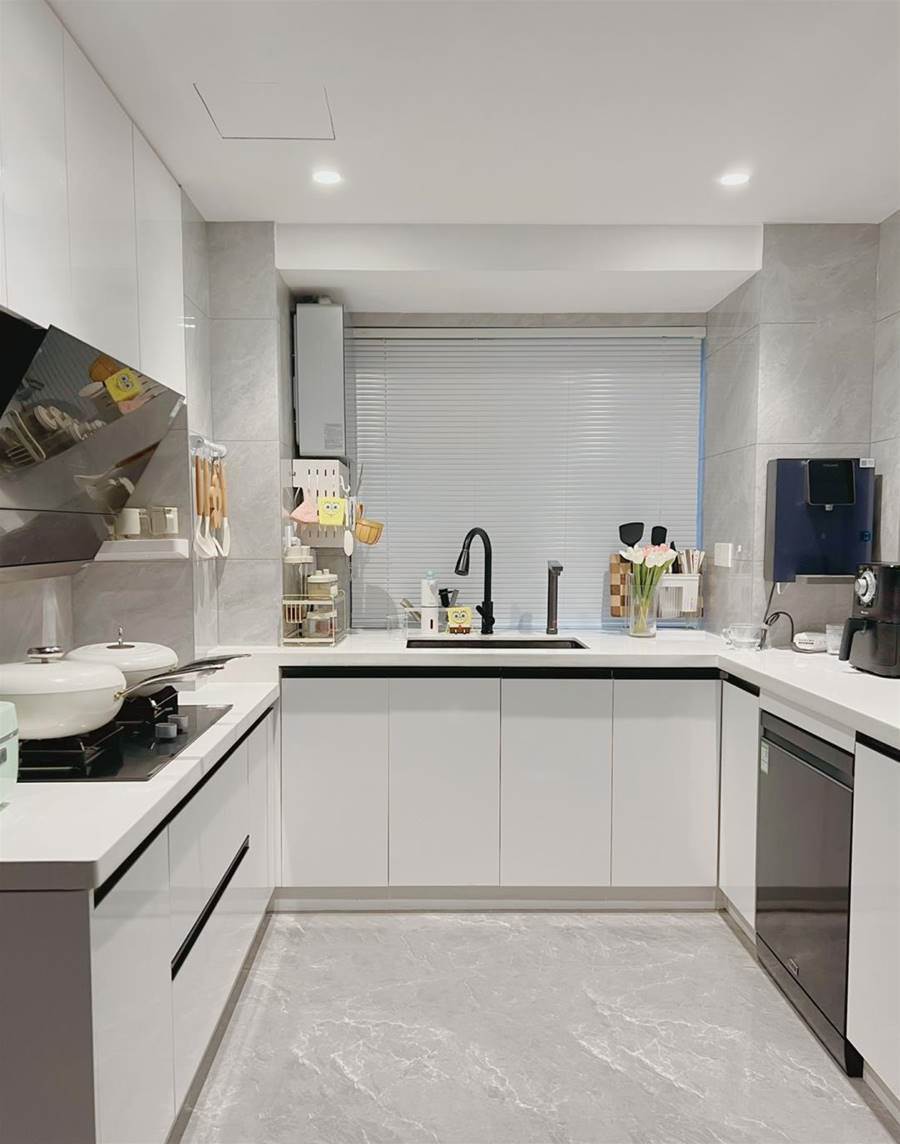 U型布局:依靠墻體形成三角形的廚房動線,台面和儲存空間較多,是較實用的廚房布局。即使是小戶型也可以采用U型布局,可以在一側設計吧台,既能當操作台,也可以當餐桌使用。