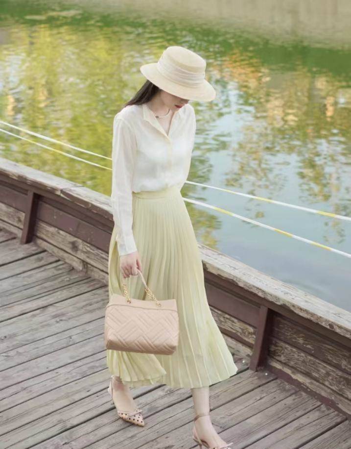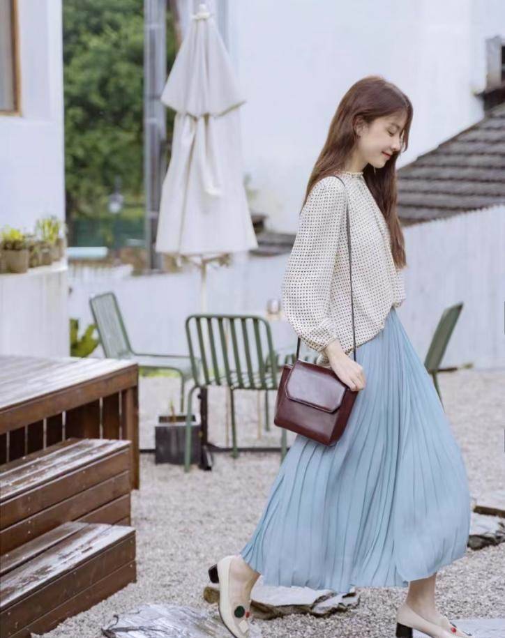 說實話我也是今年初次體驗了云朵衫+膝下裙的穿法,以前我會覺得這種穿搭太「乖」太淑女,沒想到風格也是可以多變的。