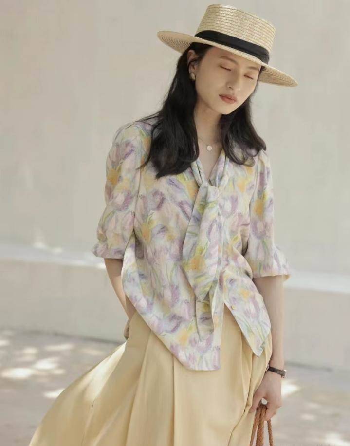 這樣可以保證清新雅致的風格,又可以提升衣服的豐富感,而且暈染的印花,不會像明顯印花那樣太突兀。皮膚白皙的女生,可以考慮一些顏色淡的底色,比如淡粉色、淺藍色等;黃黃皮嘗試米色作為底色再加暈染印花,有提亮膚色的作用。