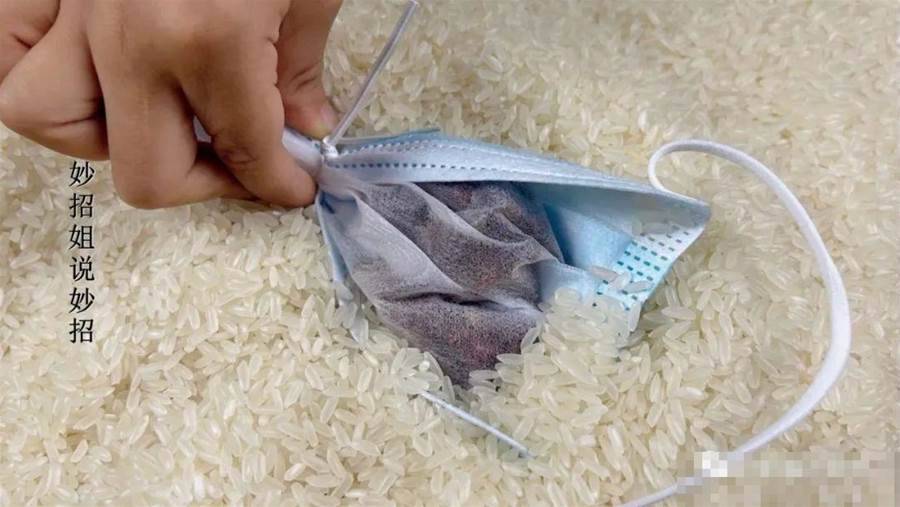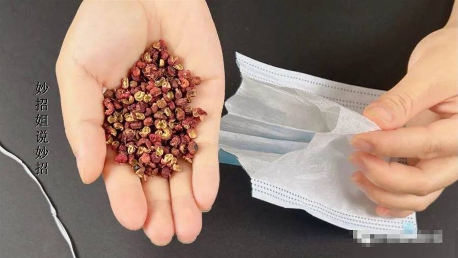 在進行米蟲驅除之前,需要先準備一個一次性口罩并將其剪開一端,取出口罩鼻梁上的鋼絲條。接下來需要準備一些花椒,將其放置于口罩的口袋中,然后用鋼絲條將口袋扎緊,制作出一個小巧的驅蟲小香囊。如果家里的大米有點多可以考慮準備3個。