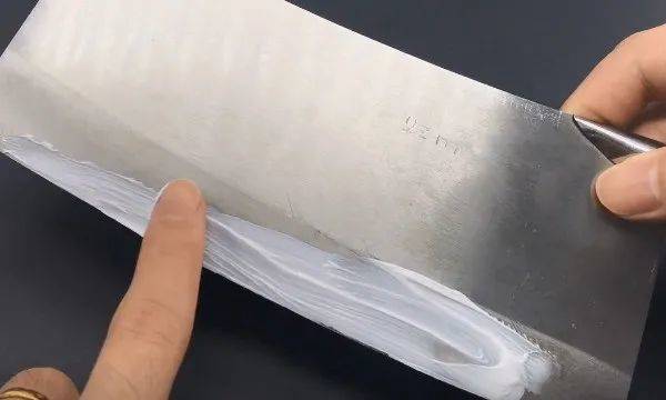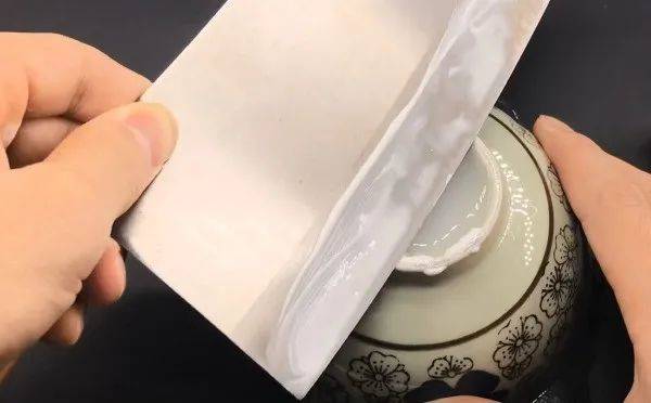 第三步:牙膏中含有摩擦剂,涂抹在菜刀上,而瓷碗相当于磨刀石,用这个方法磨菜刀,不用买磨刀石,菜刀也能锋利如新了,是不是很实用呢?