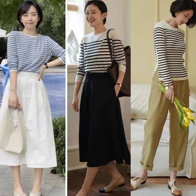 黑白條紋與藍白條紋都是特別顯白的單品,搭配一條溫婉雅致的半身裙,輕松穿出優雅女人味來。黑白條紋針織衫搭配卡其色休閑褲,又是另一種風格,簡約舒服,特別適合秋日出行穿,輕松自在又減齡。