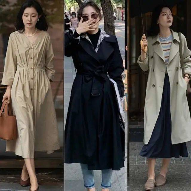 秋天可以選擇一寬松的版型的風衣,自帶灑脫的颯美,有走路帶風的大氣。卡其色風衣,簡單的寬松款更高級,搭配優雅的黑色半裙,很有女人味。