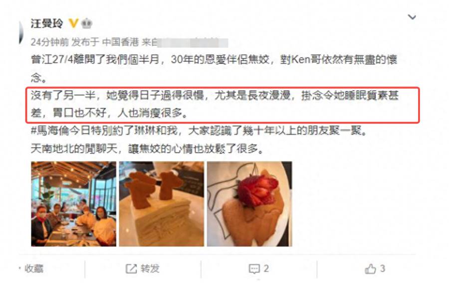 後來在親友的陪伴下焦姣漸漸走出傷痛,出席聚會的狀態也越來越好,上次汪曼玲又在社交平台貼上與金漢大哥及凌波聚會的照片,焦姣亦有出席,在相中見到焦姣不時露出淡淡的笑容,頭髮亦染回啡黑色,精神狀態總算恢復往昔。