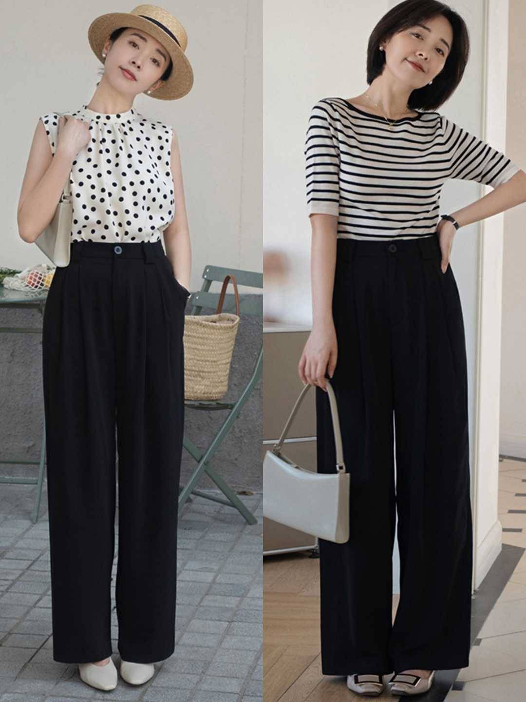腿粗的女生對于身材如果不夠自信,可以安排上闊腿褲的搭配,在這個夏天一條黑色的西裝闊腿褲也能夠幫助我們打造各種各樣的造型,配上襯衫,T恤,或者是像這種條紋和波點的上衣也能夠營造出高級感,看上去很時尚,腳下搭配今年流行的復古方頭鞋,韻味十足。
