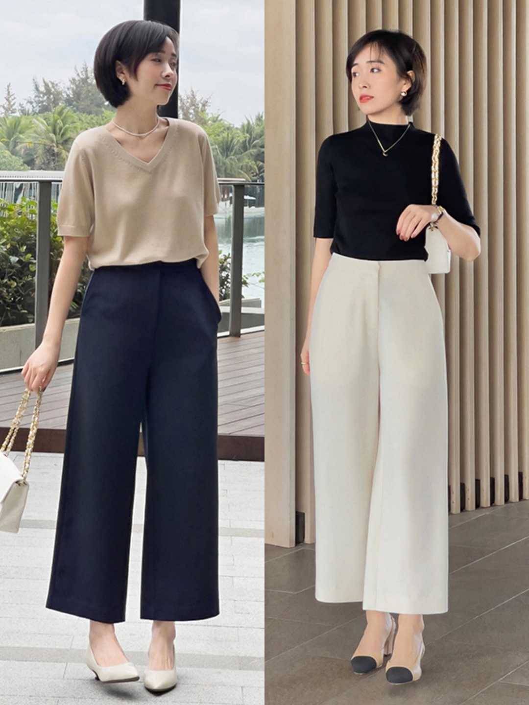選擇闊腿褲的時候,大家可能也比較糾結顏色,除了黑色之外,這種白色的闊腿褲也很好看,白色闊腿褲的穿搭更加清楚,而且還非常適合夏天,上面可以去搭配深色的上衣,這樣的話能形成對比。