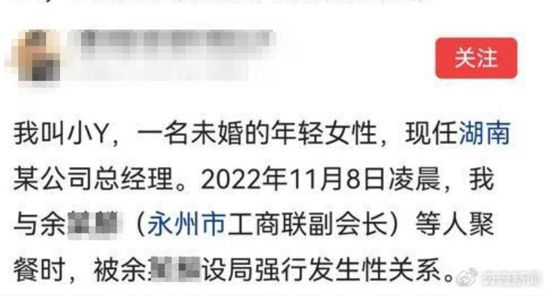 綜合陸媒報導,受害女子9日在社群發文,自稱目前在湖南擔任某公司總經理,而且年輕未婚,並指事發于2022年11月8日凌晨,她與湖南永洲市工商聯副會長余男等人聚餐後,被余設局強行發生[性.關.係];事發當日天一亮她便報案,公安局也逮捕到余男。