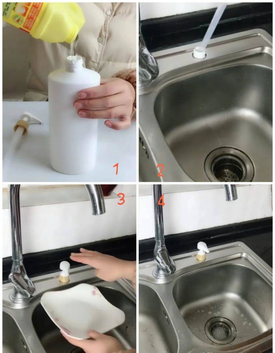 方法非常的簡單,我們準備一個帶壓泵的小瓶子,沐浴露或者是洗髮水的空瓶子就可以,然后將洗潔精倒入瓶中,接下來我們把壓泵頭放進小孔,把瓶子從水槽下方伸上來,最后擰緊壓泵頭。這樣我們用洗潔精的時候,不用來回走動去翻找,只需要伸手擠壓一下泵頭,洗潔精就出來了。