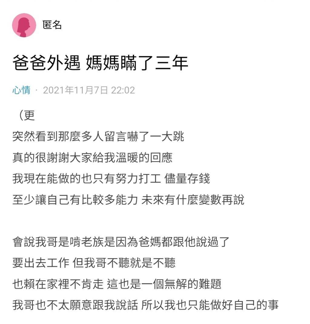 原PO聽完媽媽獨自隱忍3年的事實,氣得直接出門到爸爸平時去的書店查證,爸爸的車果真沒有停在他聲稱的地點。原PO腦袋一片空白、思緒紊亂,無法想象生活規律的爸爸會外遇,同時心疼媽媽的境遇,希望有能力讓媽媽搬出去住。原PO為媽媽的遭遇感到虧欠:「原本相信的事情全部都崩塌了。」