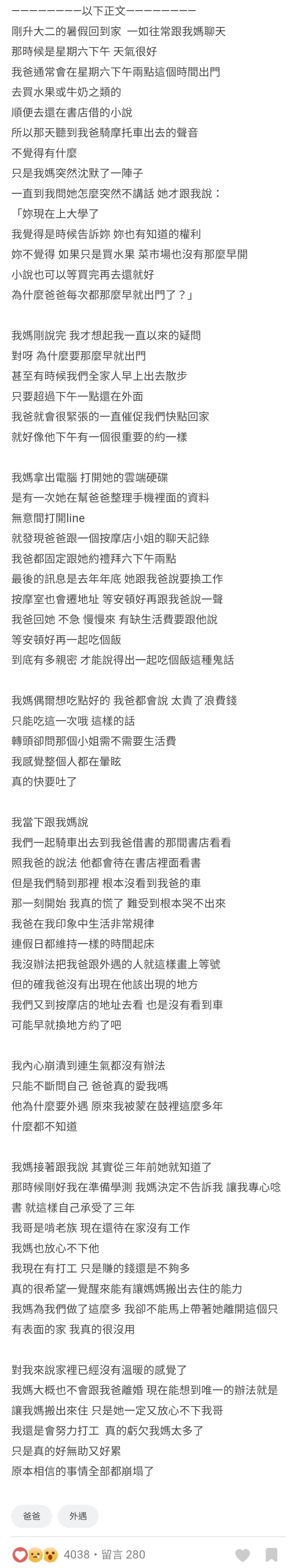 媽媽向原PO坦白,說女兒已經念大學了,所以決定讓她知道。媽媽的雲端硬碟裡存有爸爸和一位按摩店小姐的聊天紀錄,是3年前原PO考學測時媽媽不小心發現的。其實爸爸會急著在每週六下午2點出門,就是為了和按摩店小姐見面。原PO發現平時小氣的爸爸竟然對外遇對象很大方,還願意提供生活費。