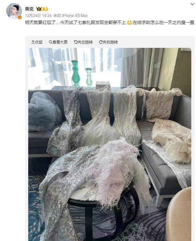 像黃奕在走紅毯前一口氣試了七套禮服,發現全都穿不上,崩潰得在線求助如何能在一天之內瘦一圈。