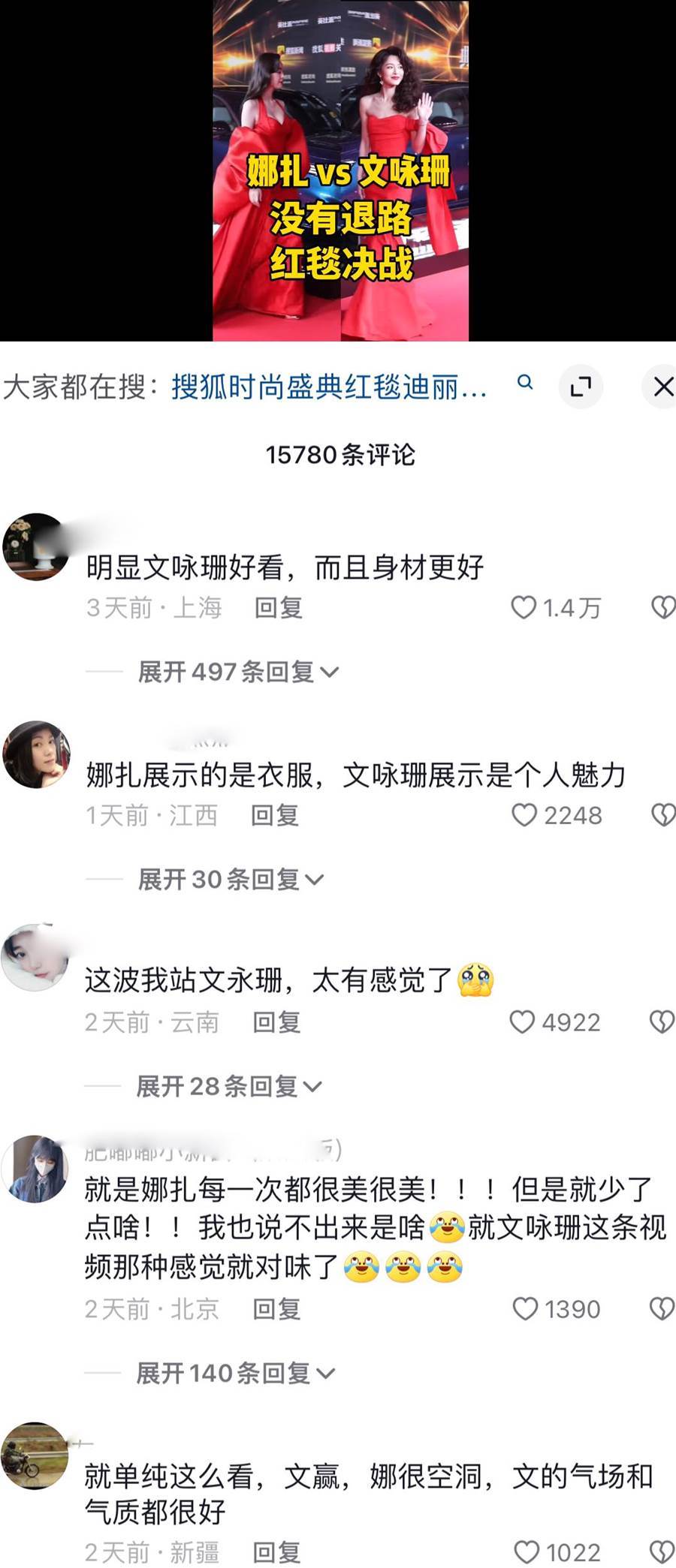 活動結束后有娛樂博主做了一個文詠珊與娜扎的同框對比,網友在評論區踴躍發表自己的觀點,隨手一翻發現竟然是文詠珊獲得的好評率更高。