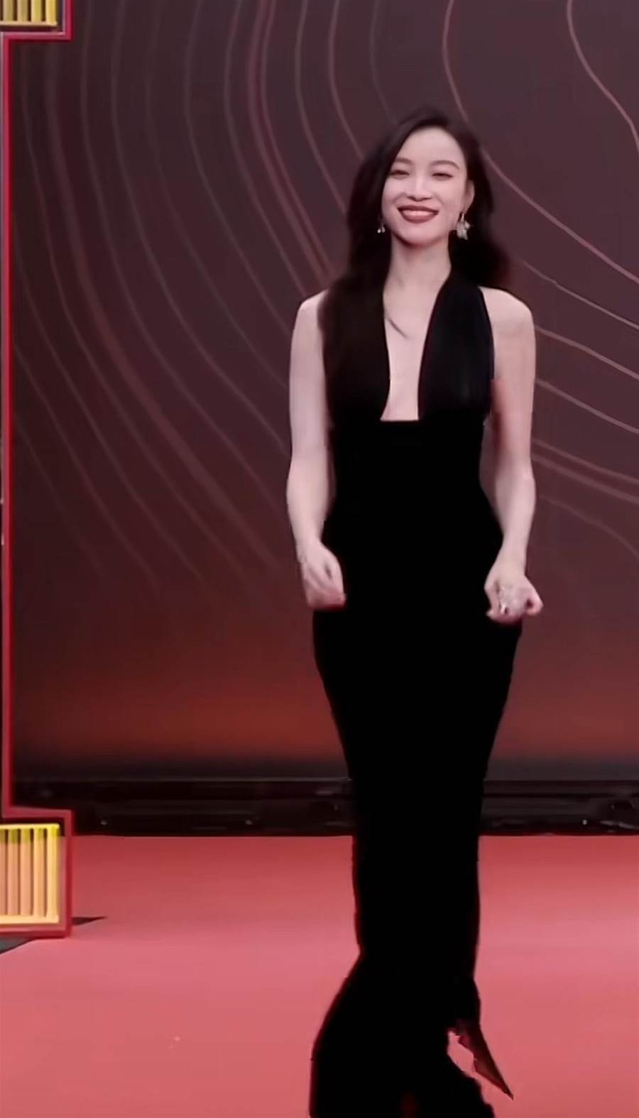 黑白是她紅毯最常用的色彩,而一身火紅的長裙則讓她展露了風情和女人味,身材玲瓏有致,紅裙黑發更是襯得皮膚白到發光,那麼明艷動人。