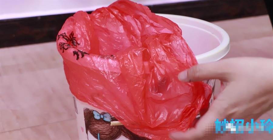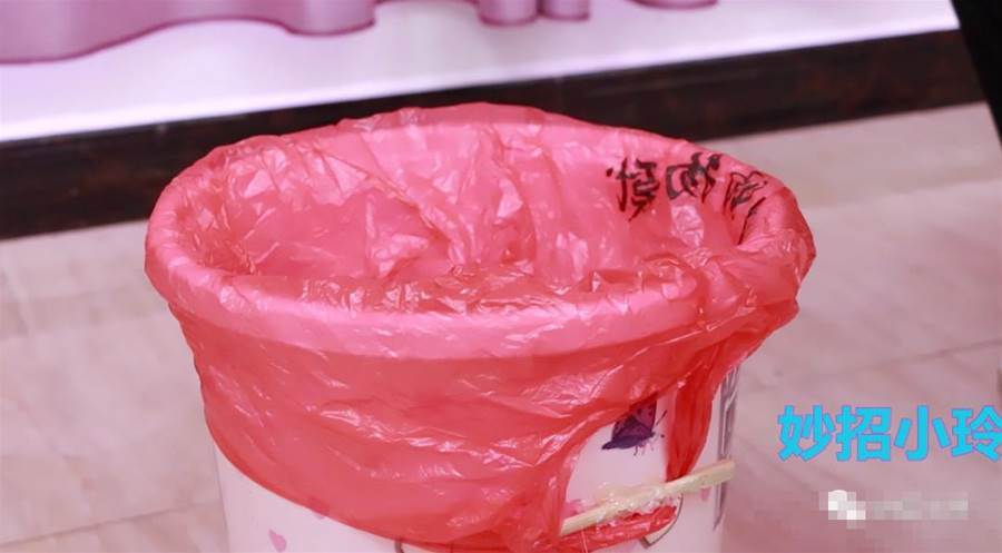 我們可以用塑料袋用來做垃圾袋比較節約,接下來我們直接將塑料袋提手,給它掛在筷子上面