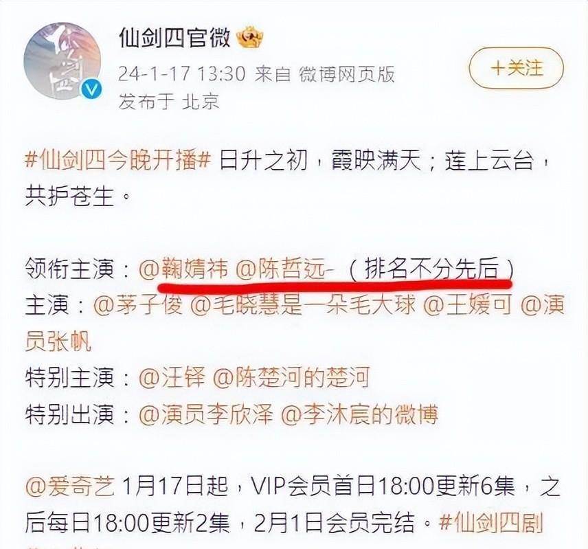 《仙劍四》于2022年2月開拍,最初拍攝時,不少物料都顯示鞠婧祎為一番女主角,當初陳哲遠也還沒有演到《偷偷藏不住》爆火,這樣的番位被認為是合理的。 但劇方遲遲沒有官宣演員陣容和番位,後來營銷號傳出不是鞠婧祎一番了,男女主角為平番,雙方粉絲就大吵過一次架,而最近《仙劍四》開播前終于公開演員名單,最終陳哲遠和鞠婧祎平番。