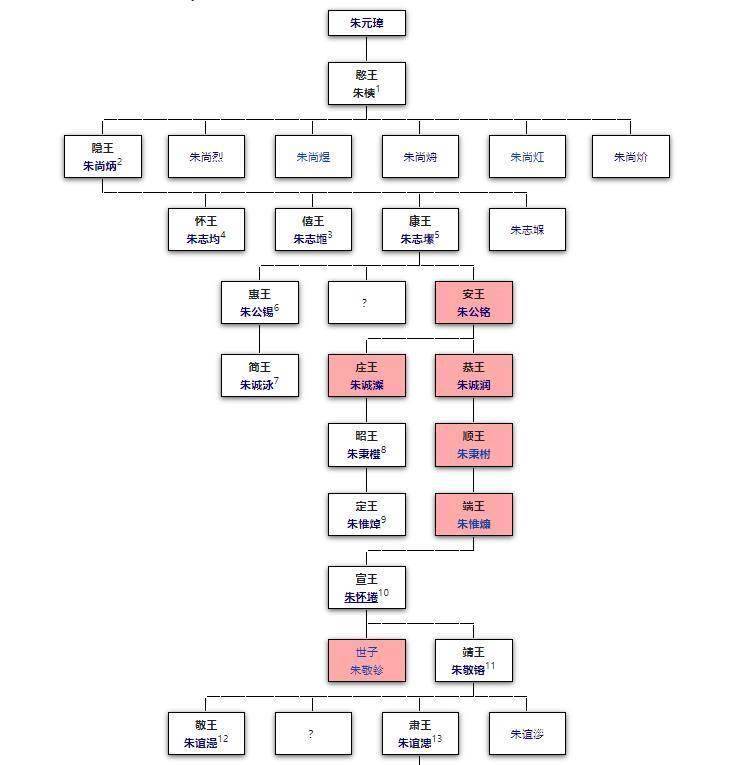 朱尚炳實際還有5個弟弟,按照祖訓,5位弟弟皆被封為郡王,他秦王的位置由自己嫡次子朱志堩繼承,后續秦王也都出自于朱尚炳的后代。