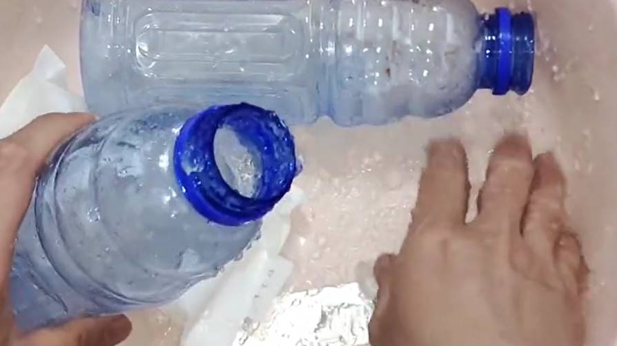 第二個小妙招,我們在家里面準備一些碎冰塊,或者說提前把這個飲料瓶放在冰箱里面給它凍一凍,把它凍成冰塊或者說凍成涼水都可以,它的效果幾乎是一樣的。