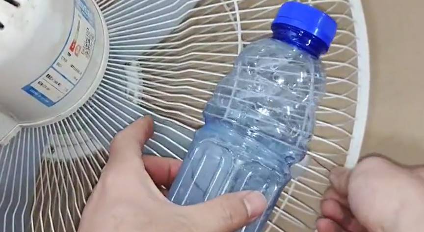 之后我們把這兩個瓶子綁在風扇上面,我們把這個有小孔的地方對準這個位置,之后把它綁在這個風扇它的一個背面,像這樣子把它綁好,我們可以綁兩個,三個,五個瓶子都可以,這樣子它的制冷效果會更好。