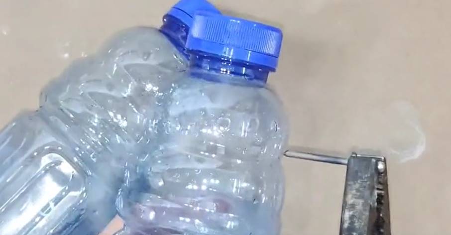 把它給裝好了之后,我們需要在上半部分給它開出來小孔,這樣子有利于涼氣透出來呀,我們給它裝上冰塊之后,找一個鉚釘或者說鐵釘,我們用這個打火機噴槍給它加熱之后,把這個瓶子上半部分給它扎出來小孔,像這種效果我們給它弄出來一個一個的小孔。