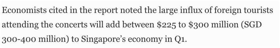 演唱会门票、住宿、购物这些累计旅游花费可能就达到了3亿新元。