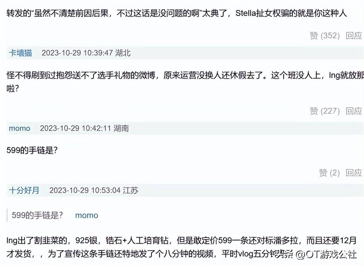 直到世界賽開始,粉絲找不到負責人才發現運營休假去了。為了賺女粉的錢,LNG最近上架一款手鏈,用的是925銀和人工培育的鉆石。如果沒有溢價,這手鏈只需要幾十塊。EDG等戰隊也有類似周邊,價格是90元左右,而LNG戰隊要價599,粉絲提出質疑還被拉黑。