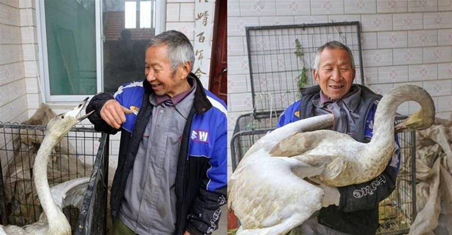 呂大叔從籠子裡抱起白天鵝,也許是白天鵝知道要和救他的呂大叔分離了,