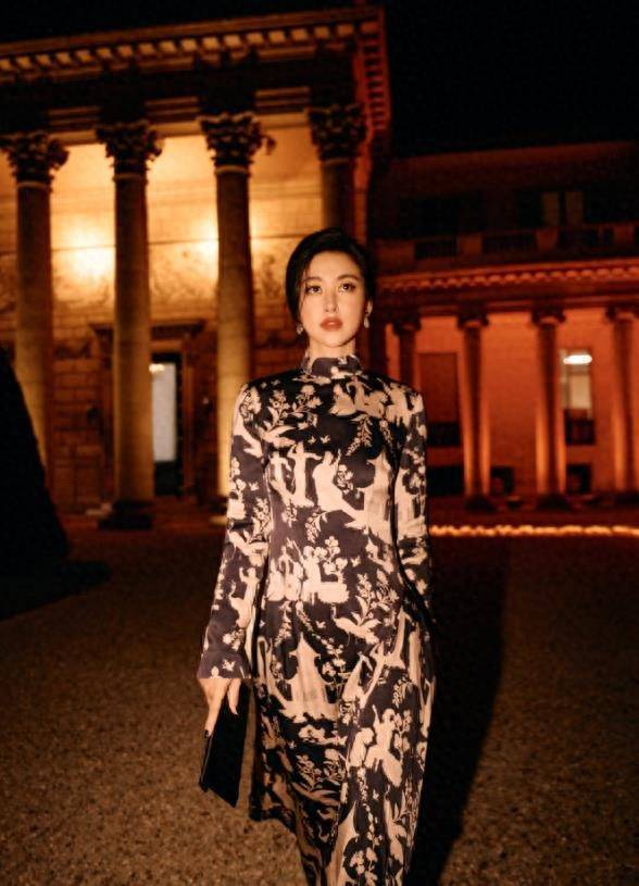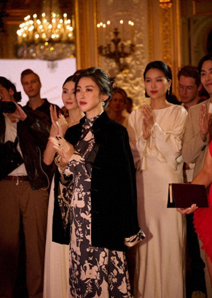 同樣身在巴黎的朱珠也身著一套改良過的中式旗袍亮相。寫意水墨長裙搭配中式扣子外套,讓朱珠的韻味十足的東方自助餐。
